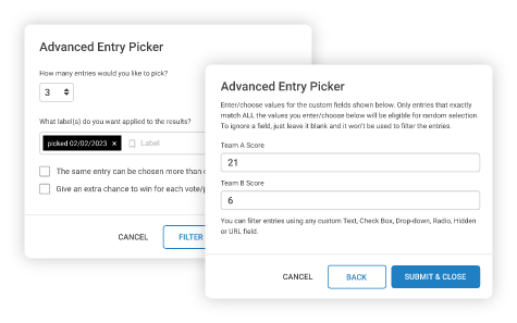 VContest campaigns aren’t one-size-fits-all. You can fully customize your forms with text fields, multiple-choice checkboxes and dropdowns – you name it. After the contest has ended, select random winners, filter your entries or export them for use outside of VContest.